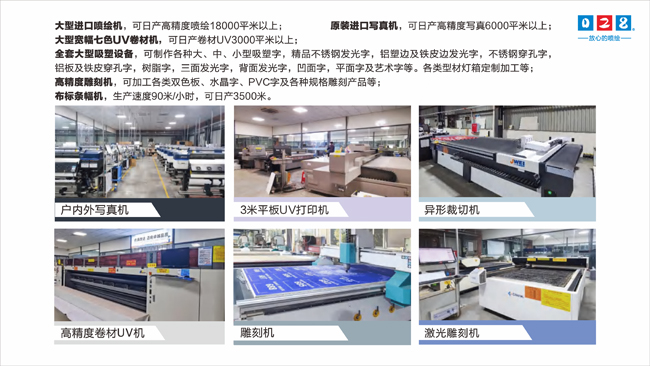 四川零貳捌廣告有限公司有著自己的設(shè)計(jì)團(tuán)隊(duì)和制作加工工廠,也配備著新的各類廣告制作的加工機(jī)械,比如噴繪機(jī)、裁剪機(jī)、UV打印機(jī)、雕刻機(jī)等等。